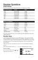 Receiver Operations Initial Settings From the manufacturing facility, the receiver is configured as follows: Line Locate Frequencies Selection Default 8 kHz Always Enabled Enabled 82 kHz Always Enabled Enabled Power Always Enabled Enabled Radio Enable/Disable Disabled CATV Enable/Disable Disabled CPS Enable/Disable Disabled 512 Hz Enable/Disable Enabled 640 Hz Enable/Disable Disabled 33 kHz Enable/Disable Enabled Units inch or cm Inch Power Frequency 50 Hz or 60 Hz 60 Hz