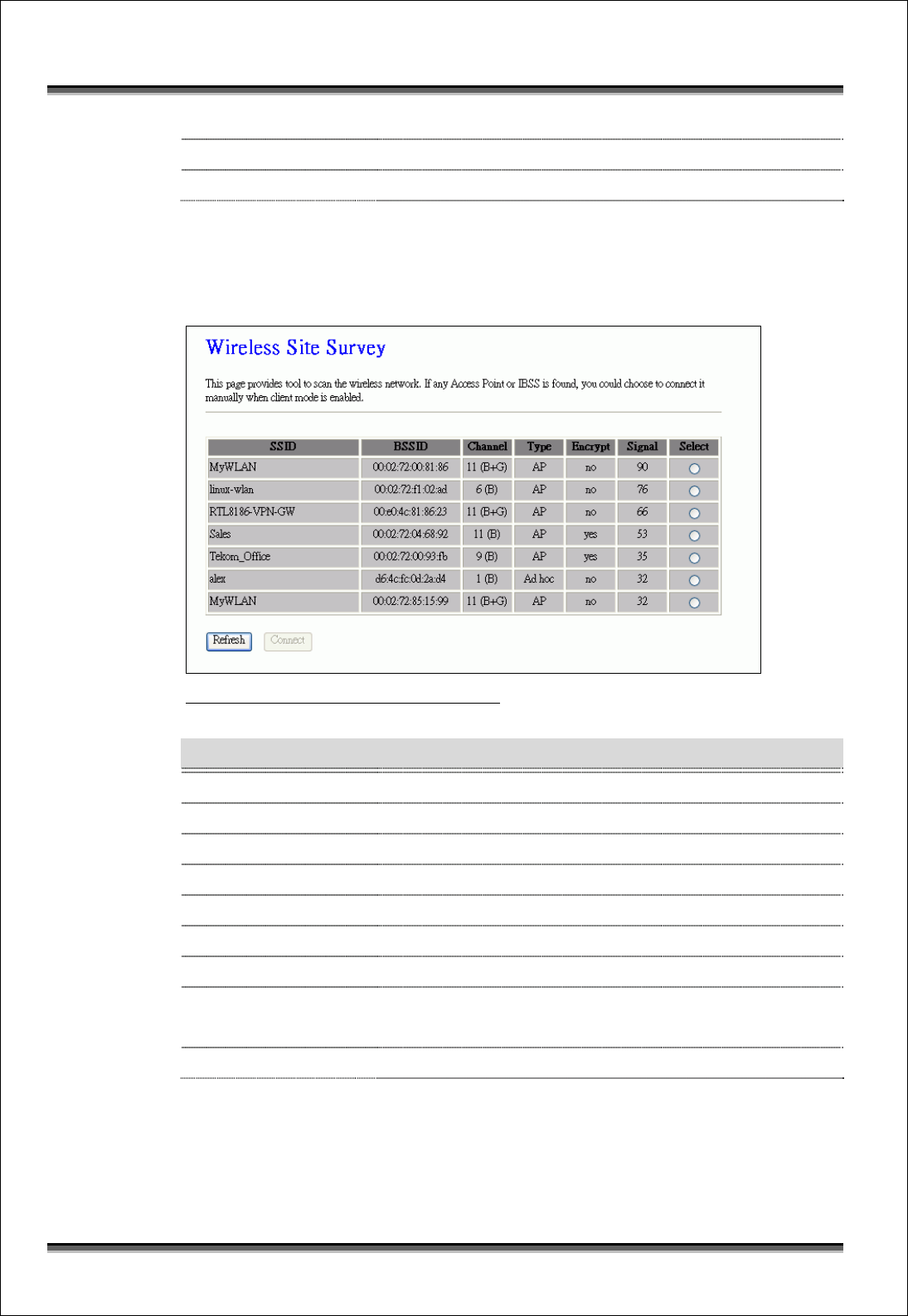 Refresh Click the Refresh button to re-scan site survey on the