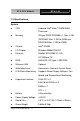 ETX CPU Module ETX-LN Operating Temperature 32°F~140°F (0°C~60°C) Storage Temperature -40°F~176°F (-40°C~80°C) Operating Humidity 0%~90% relative humidity, non-condensing Display: Supports CRT/LCD simultaneous/ dual view displays Chipset Intel® D525/N455 integrated Integrates hardware MPEG2 decoder Memory Shared system memory up to 256MB/ DVMT 4.