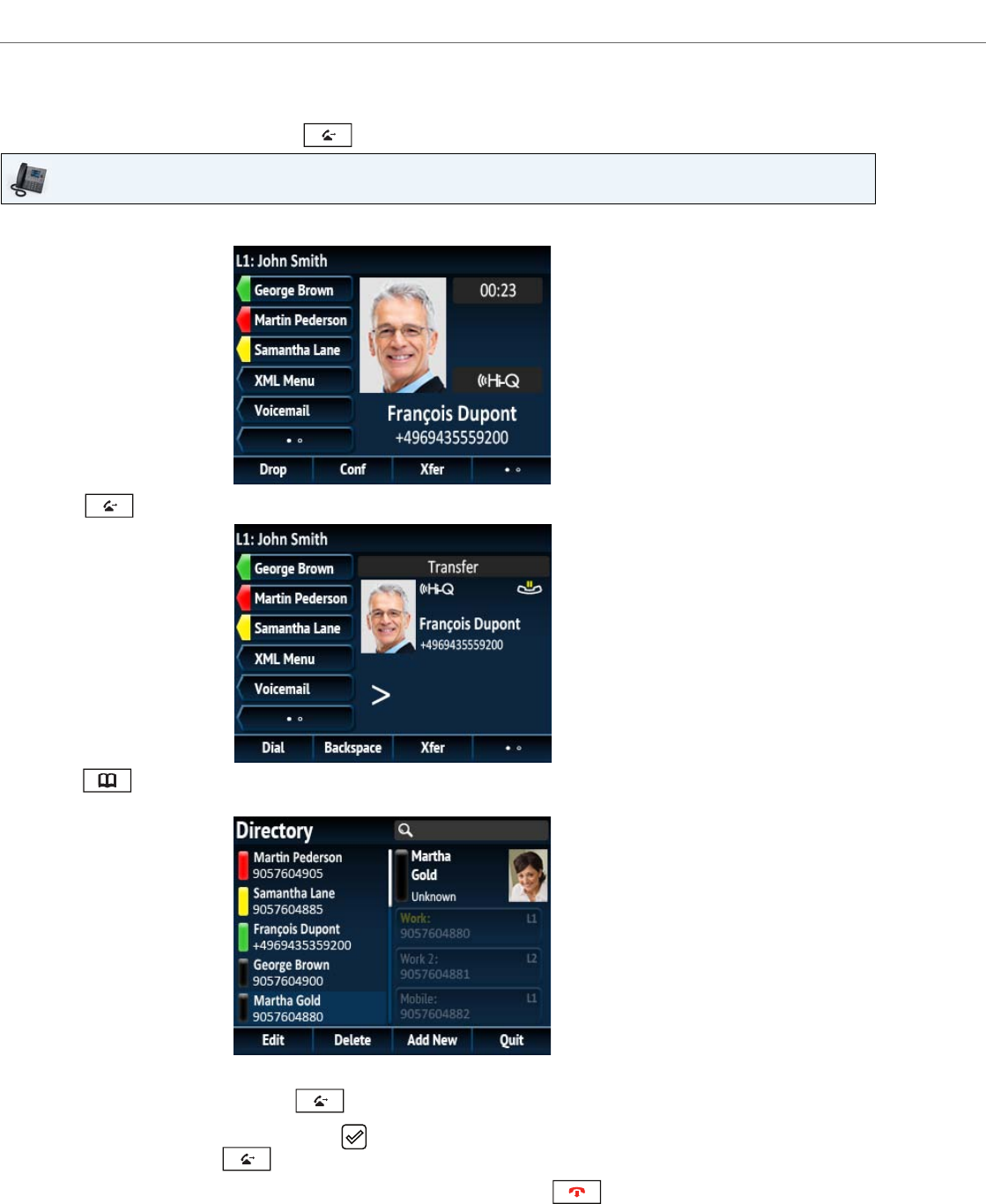 b) To complete a consultative transfer, press the button to call the contact. Remain on the line to speak with