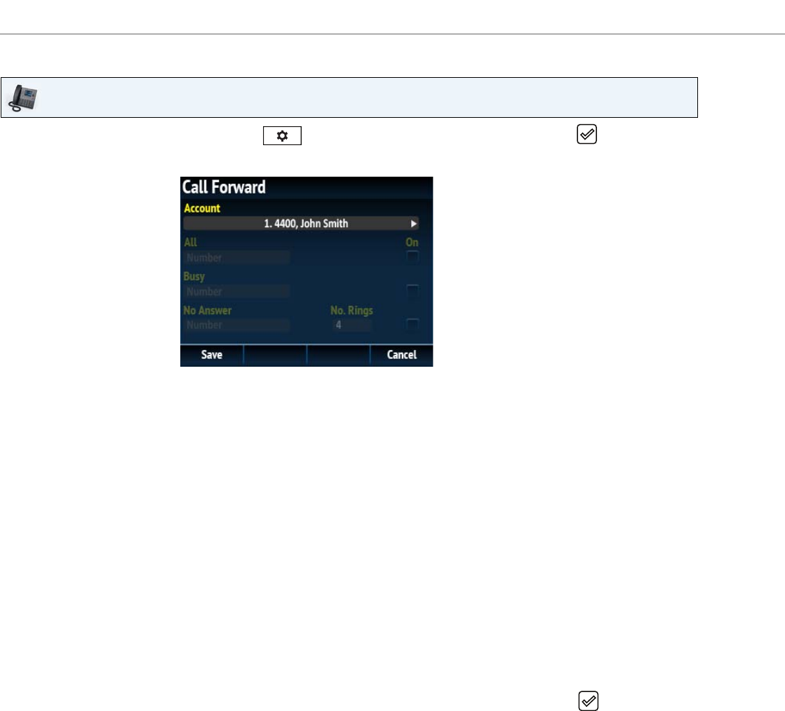 1. Press the configured Call Fwd softkey or press , navigate to the Call Forward option and press the