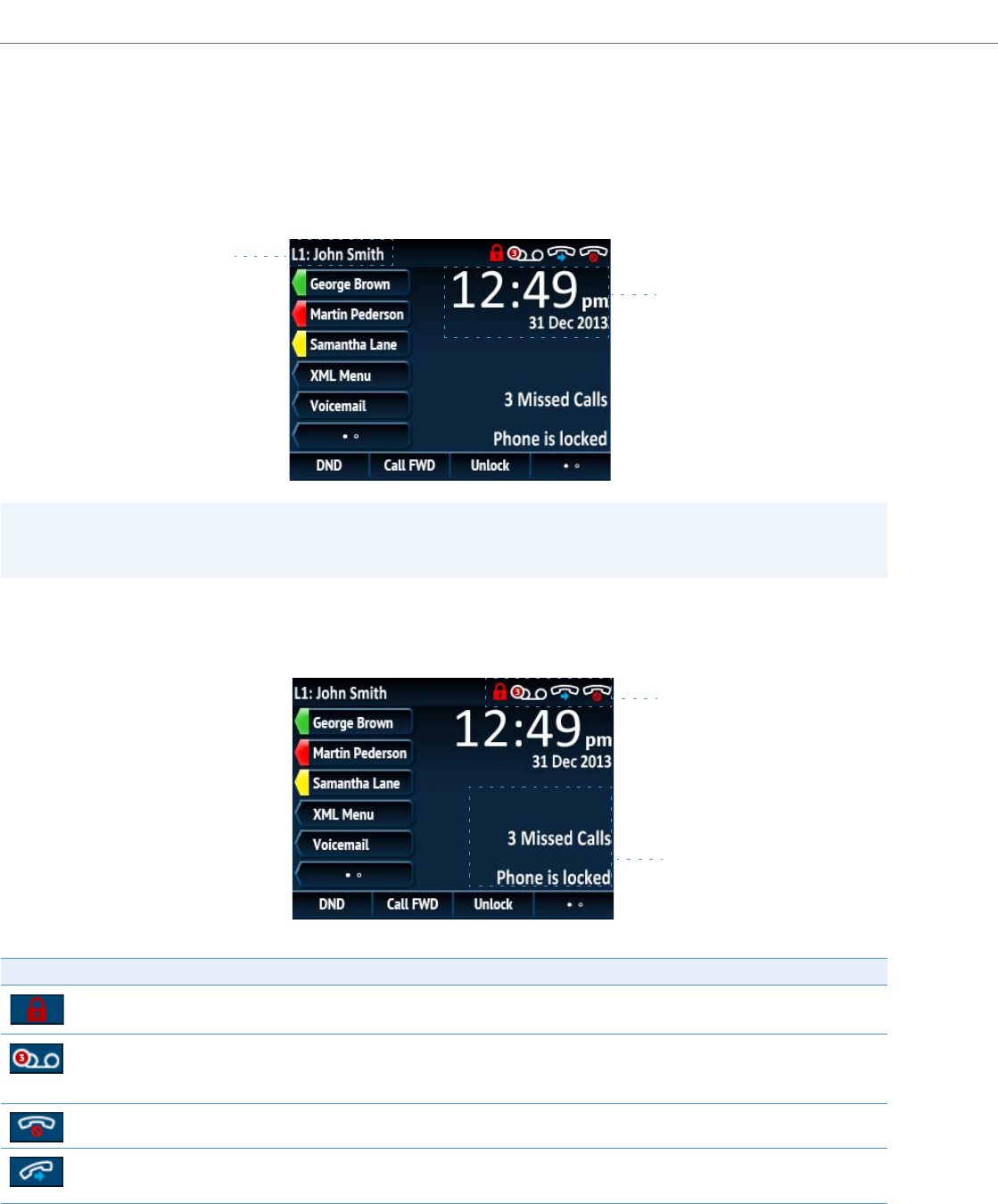 There are icons that display on the phone to indicate the status of the phone and/or the status of the line. These icons