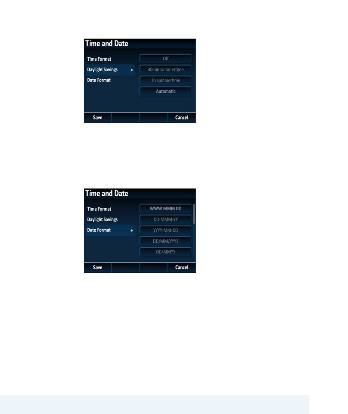 The time and date formats you configure are applicable to the Home screen, as well as the Callers and Redial lists.