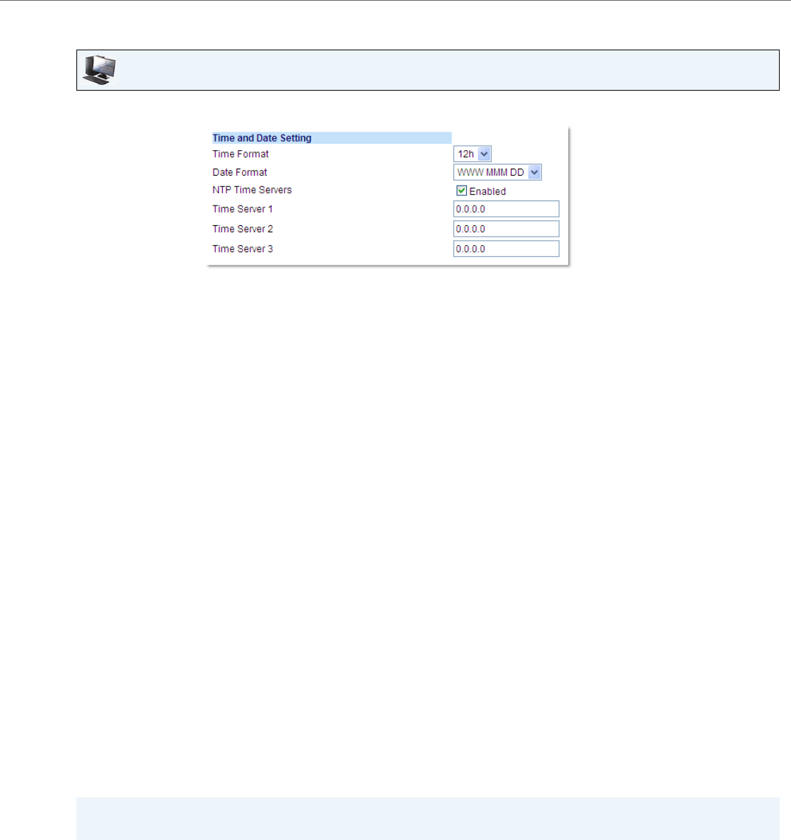 The time format you configure is applicable to the phone’s Home screen, as well as the Callers and Redial lists.