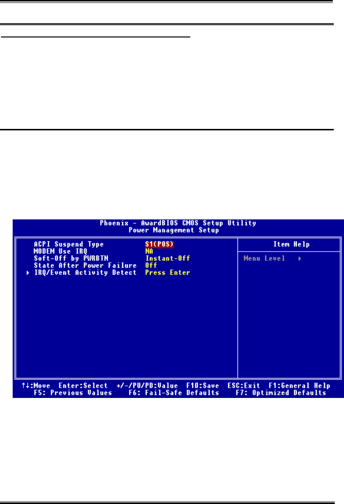 1. In the Main Menu, select “Power Management Setup” and press <Enter>. The following screen is