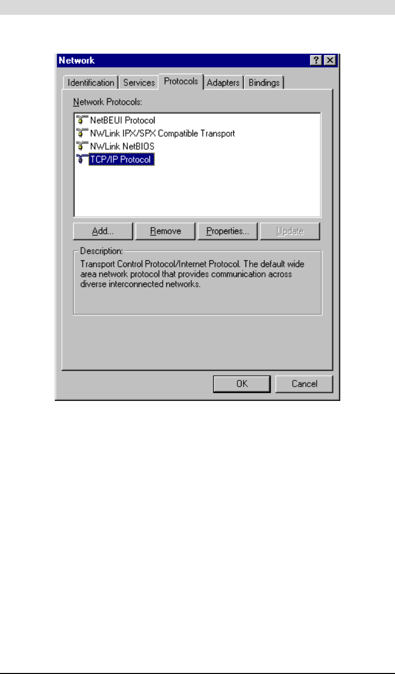 1. Select Control Panel - Network, and, on the Protocols tab, select the TCP/IP protocol, as