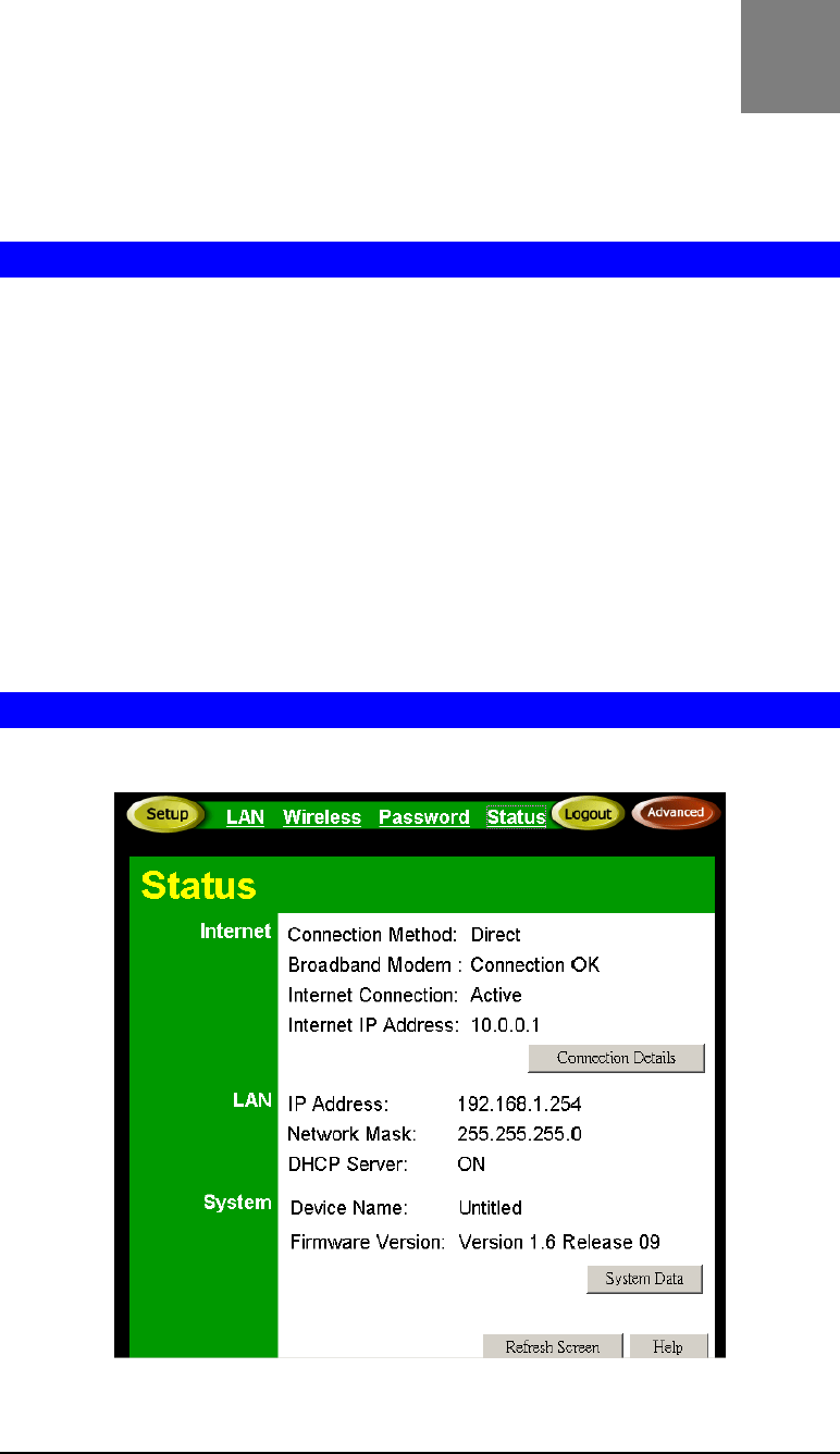 This Chapter details the operation of the Wireless Router and the status