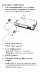 Parts Names and Functions 1. USB Connection Cable: connects the USB Home PhoneLine 1Mbps Network Adapter to the USB host port of your computer. 2. USB B Type Connector 3. USB A Type Connector 4. RJ-11 telephone ports - Line port: connects to a phone jack. - Phone port: connects to a phone setting. 5. USB B Type Port 6. USB Home PhoneLine 1Mbps Network Adapter 7.