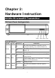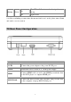 Chapter 2: Hardw are I nstruction 60GHz WirelessHD Transmitter TX Front Panel Configuration TX LED Indicators LED Power Pairing Weak Color Green Blue Green Behavior Indication On The LED will illuminate when the power is connected and the power switch is turned on. Off The LED will be dark when the power switch is turned off. Blinking Unit in sleep mode. On The LED will illuminate to indicate which RX is being selected.