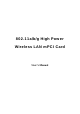INTRODUCTION The 802.11a/b/g High Power Wireless LAN mPCI Card is a device that allows you connect your computer to a wireless local area network (LAN). A wireless LAN allows your system to use wireless Radio Frequency (RF) technology to transmit and receive data without physically attaching to the network. The wireless protocols that come with this product ensure data security and isolation from interference generated by other radio frequencies.