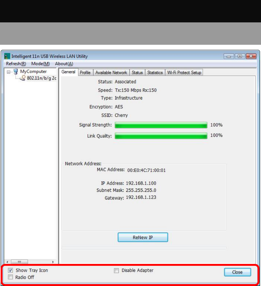 Close: Click to leave the Intelligent 11n USB Wireless LAN Utility.