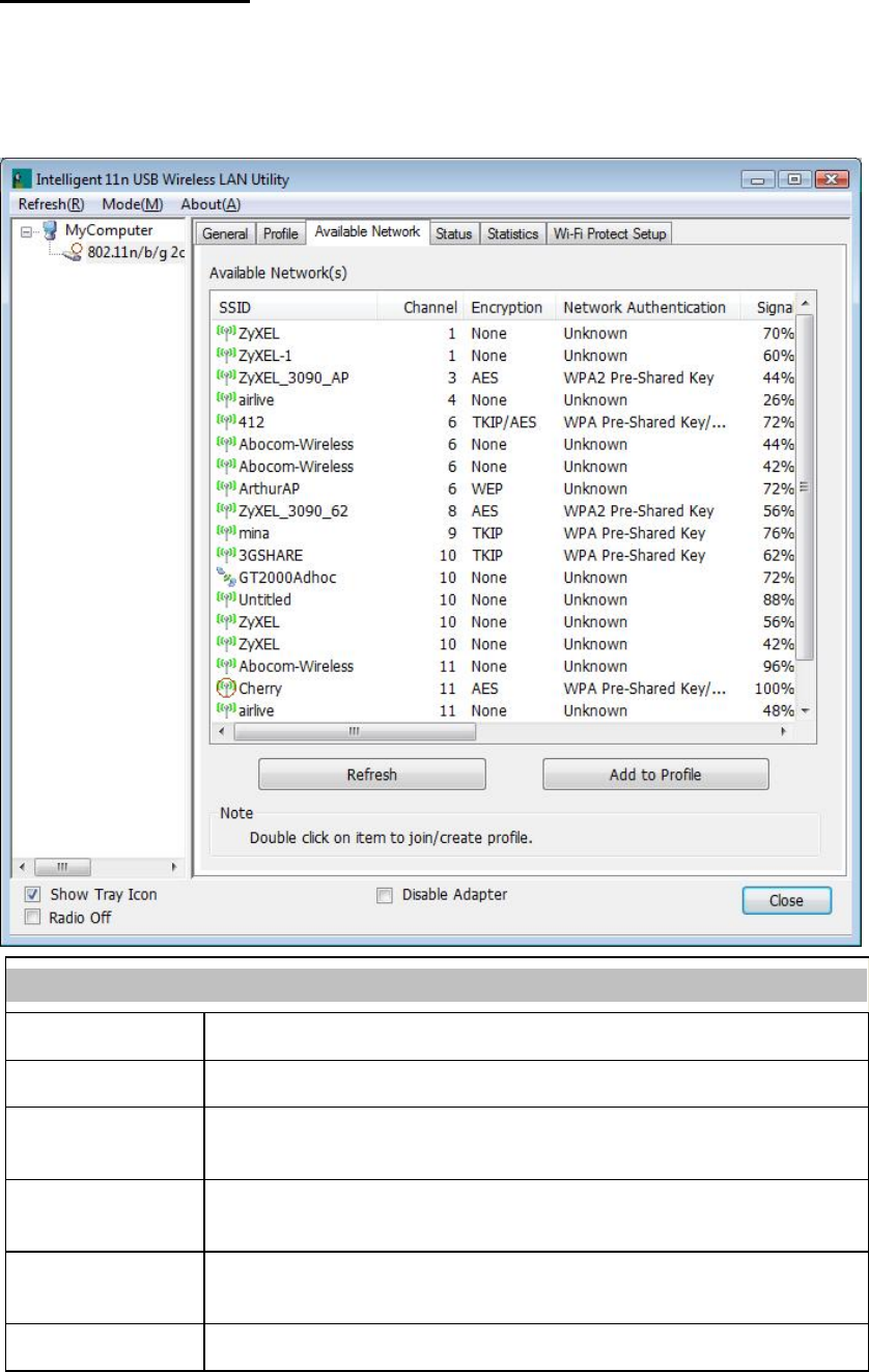 This page displays the information of surrounding APs from last scan result. The tab lists the