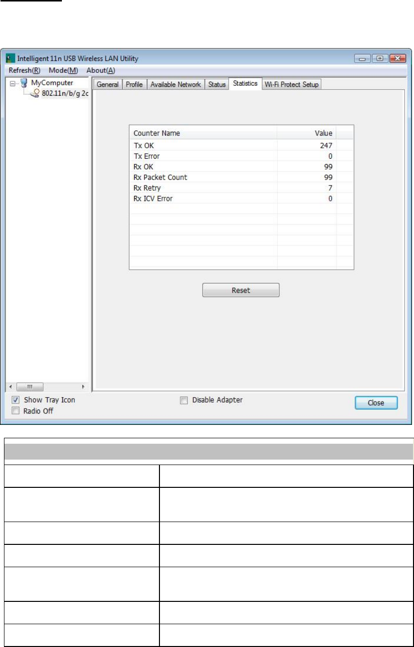 The Statistics screen displays the statistics on the current network settings.