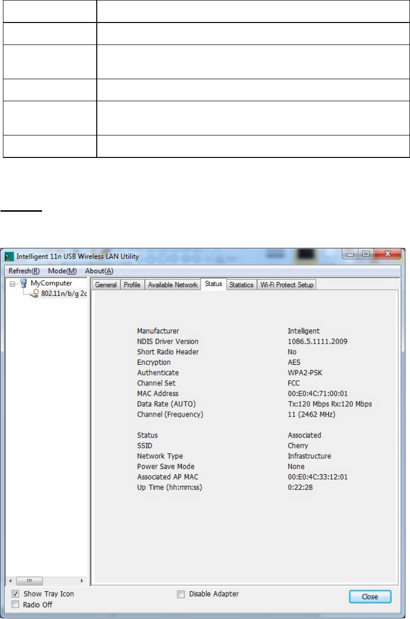 This tab listed the information about the WLAN Module and connected access point.