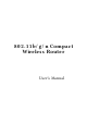 Chapter 1: Introduction This is a compact/travel size IEEE802.11b/g/n router with 2 fast Ethernet ports, which provides a powerful high-speed wireless connection for compatible wireless-enabled devices into the network with the freedom to roam. With web-based UI, this Access Point is easy to be setup and maintained. All functions can be configured within the easy and friendly user interface via web browser.