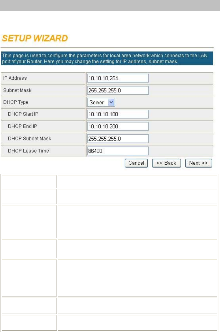 This step can set up Wireless Portable Router’s IP address, subnet mask, DHCP type, DHCP IP