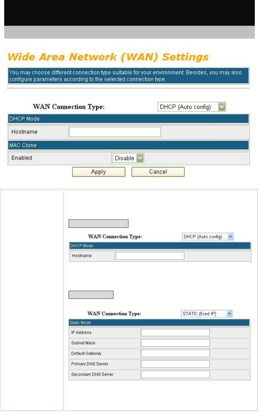 Select the WAN Connection Type Static (fixed IP), DHCP (Auto Config),