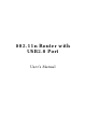 Chapter 1: Introduction The 802.11n Router with USB2.0 Port is a draft 802.11n/b/g compliant Wireless Broadband Router with 4-port Fast Ethernet Switch. 802.11n Router with USB2.0 Port with latest Draft 802.11n technology that delivers up to 150Mbps wireless, provides multi-functional capabilities, particularly the high-performance throughput and high-quality security to propose an integrated, thorough SOHO solution. The incredible speed of 802.11n Router with USB2.