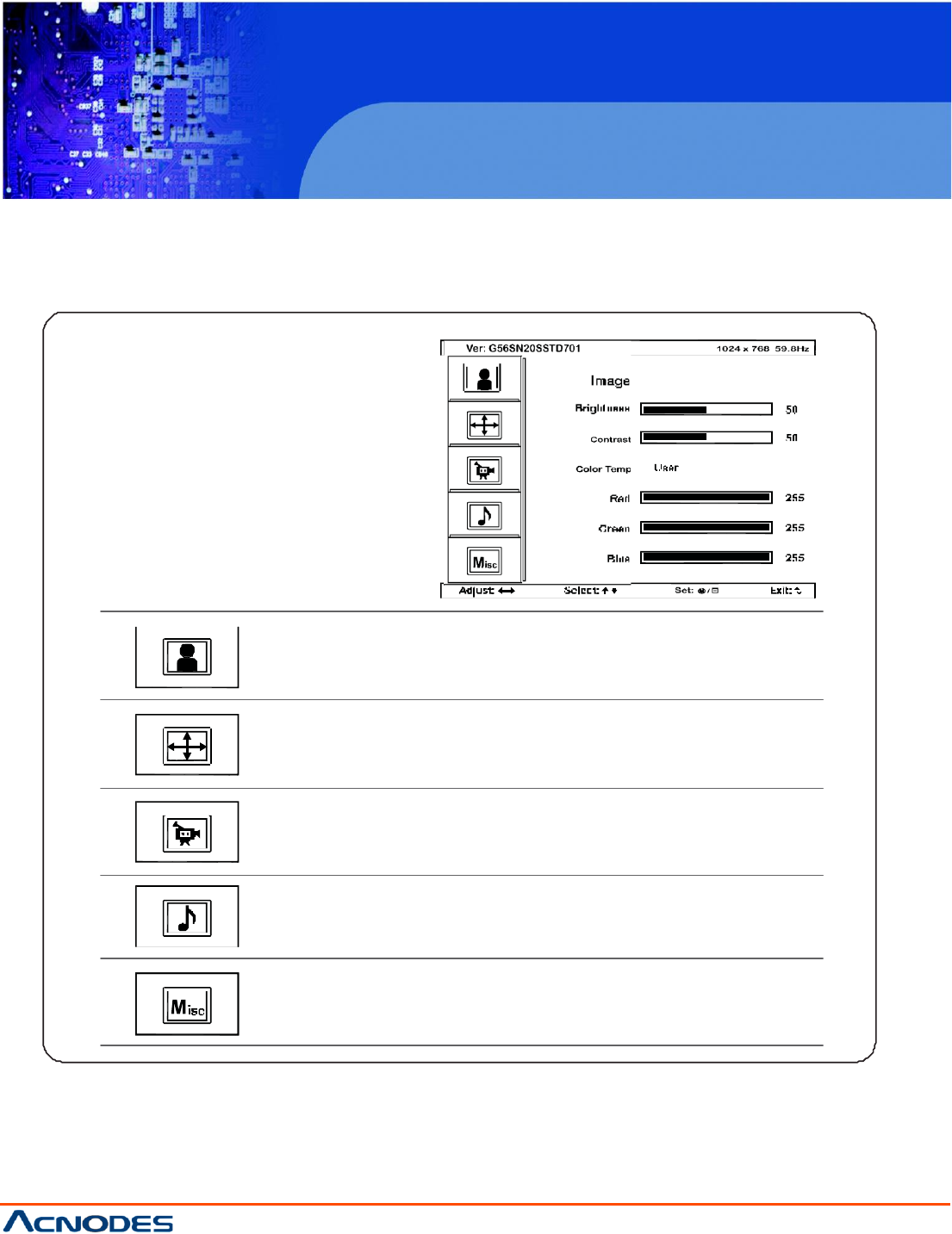 for the brightness, contrast, color temp , red, green, and blue