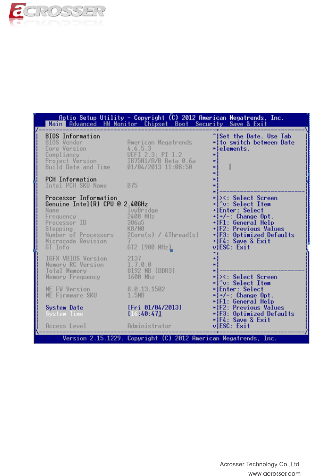 Once you enter the AMI BOS™ CMOS Setup Utility, the Main Menu will appear on the