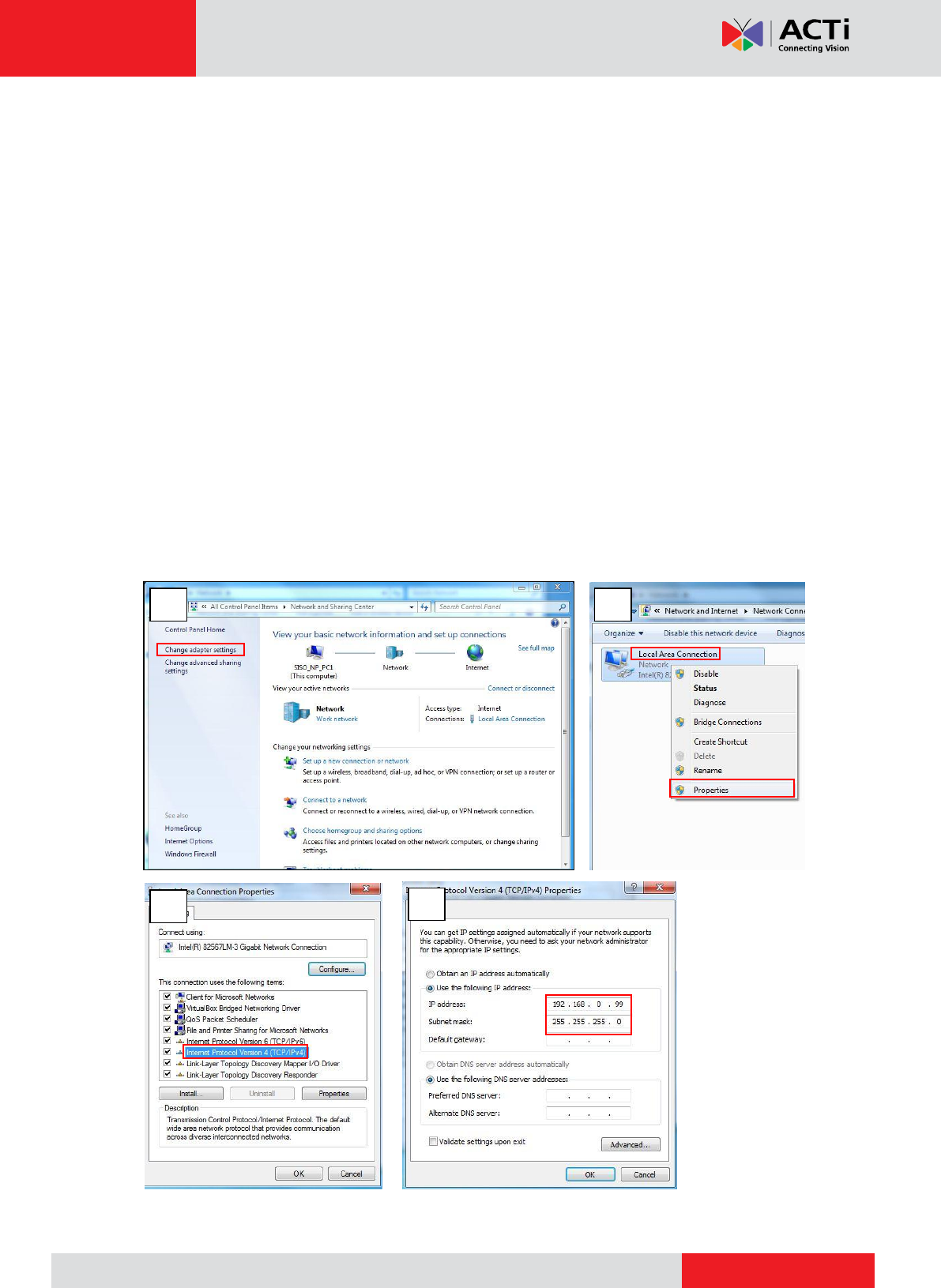 192.168.0.99 and set Subnet Mask to 255.255.255.0 by using the steps below: