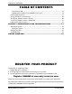 TABLE OF CONTENTS TABLE OF CONTENTS SPECIAL NOTES ................................................................................ 2 REGISTER YOUR PRODUCT ............................................................... 4 TYPICAL PRODUCT PARAMETERS .................................................... 5 Electrical Parameters.............................................................................................................................5 Performance Parameters......................................