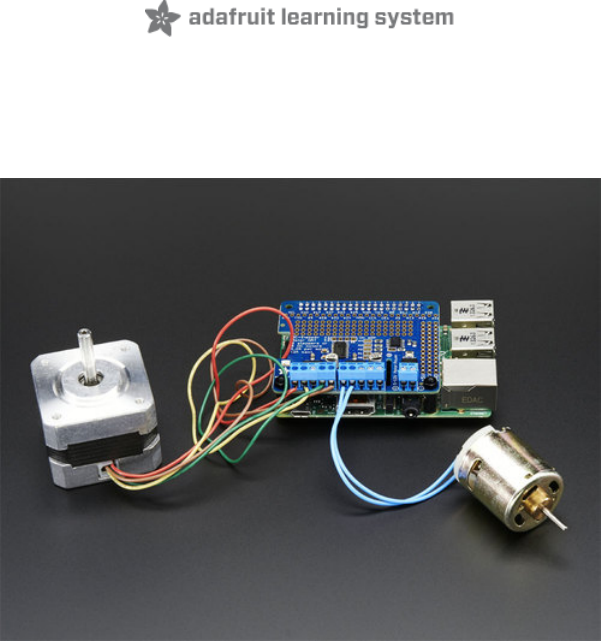 Overview Let your robotic dreams come true with the new DC+Stepper Motor HAT from Adafruit. This Raspberry Pi add-on is perfect for any motion project as it can drive up to 4 DC or 2 Stepper motors with full PWM speed control. Raspberry Pi and motors are not included Since the Raspberry Pi does not have a lot of PWM pins, we use a fully-dedicated PWM driver chip onboard to both © Adafruit Industries https://learn.adafruit.
