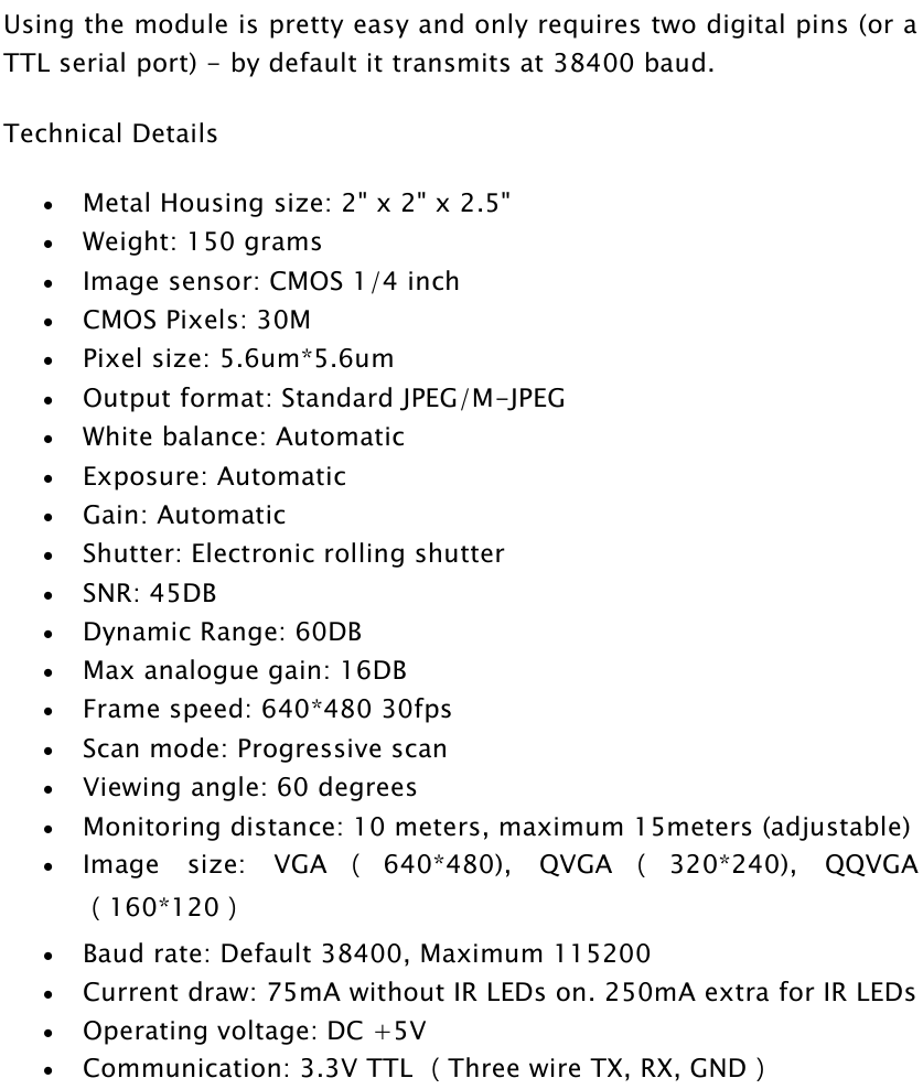 Communication: 3.3V TTL (Three wire TX, RX, GND)