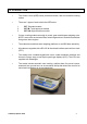 9.4 BATTERY • The scales can be operated from the battery, if desired. The battery life is approximately 90 hours. • The charge state indicator displays three stages. • To charge the battery, simply plug the scale into the mains and switch the mains power ON. The scale does not need to be turned on. • The battery should be charged for at least 12 hours for full capacity. • If the battery has not been used properly or it is used for a number of years it may eventually fail to hold a full charge.