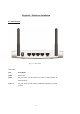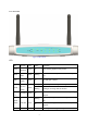 2.1.2. Rear Panel Figure 2-2 Rear Panel LED: LED Power Status WAN WLAN Link. 1~4 Function Power indication System status WAN port activity Wireless activity Color Status Description Green On Power is being applied to this product. Green Blinking Green On The WAN port is linked. Blinking The WAN port is sending or receiving data. Blinking Sending or receiving data via wireless Green Link status Green 10/100 alive. An active station is connected to the corresponding On LAN port.