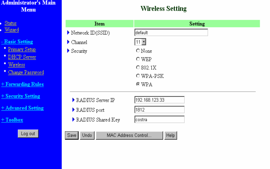 Wireless user must authenticate to this router first to use the Network service. RADIUS Server