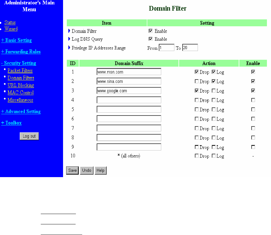 1. URL include “www.msn.com” will be blocked, and the action will be record in log-file.