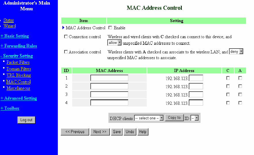 MAC Address Control Check “Enable” to enable the “MAC Address Control”. All of the