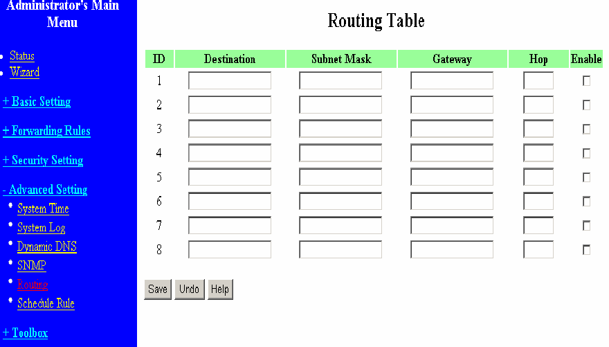 Static Routing: For static routing, you can specify up to 8 routing rules. You can enter the destination