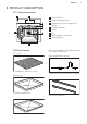 ENGLISH 7 3. PRODUCT DESCRIPTION 3.1 General overview 1 2 3 4 5 5 4 8 3 6 2 1 1 Control panel 2 Electronic programmer 3 Socket for the core temperature sensor 4 Heating element 5 Lamp 6 Fan 7 Shelf support, removable 8 Shelf positions 7 3.2 Accessories Wire shelf For cookware, cake tins, roasts. Baking tray For cakes and biscuits. Combi pan For cakes and biscuits. To bake and roast or as a pan to collect fat. Core temperature sensor To measure how far the food is cooked.