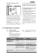 ENGLISH Problem Possible cause Solution The product temperature is too high. Let the product temperature decrease to room temperature before storage. The room temperature is too high. Decrease the room temperature. Water flows on the rear plate of the refrigerator. During the automatic defrosting process, frost defrosts on the rear plate. This is correct. Water flows into the refrigerator. The water outlet is clogged. Clean the water outlet.