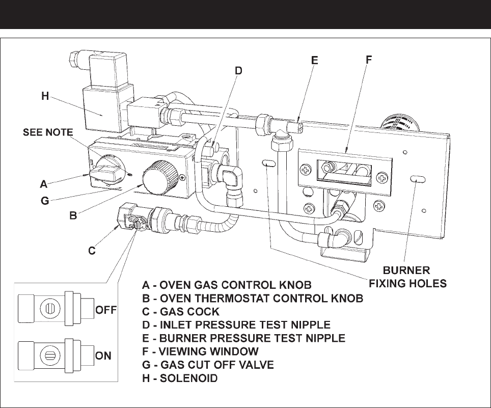 4. Turn on gas cock (C) and refit facia making sure the rubber pressure test tube is routed through the
