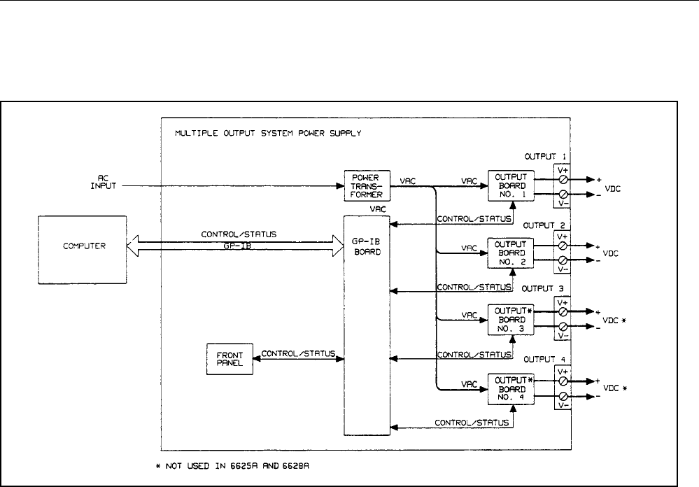 figure, each supply includes a power transformer, two or more output boards, a GP-IB board, and front panel (display and