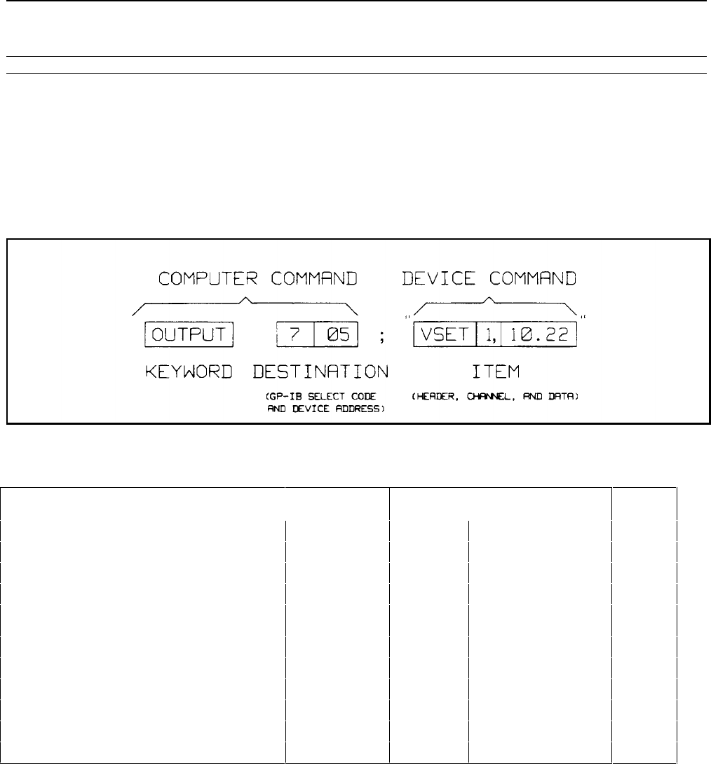 The following paragraphs describe the syntax of the device command that is used to program your power supply. As shown