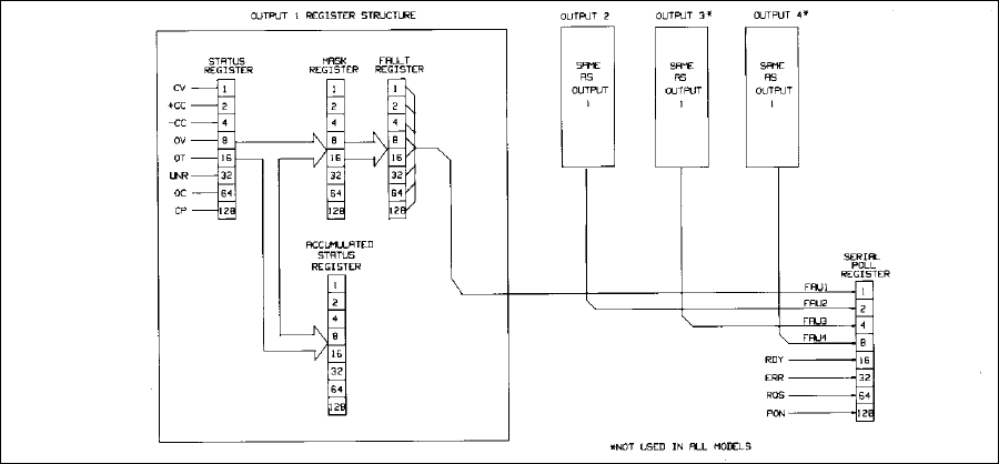 The supply has one serial poll register which services all outputs and provides the user with other power supply status-