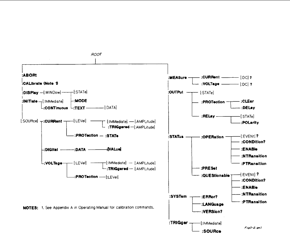 Figure 3-2 is a tree diagram of the subsystem commands. Commands followed by a question mark (?) take only the query