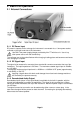 2 Basics of Operation 2.1 External Connections 2.1.1 DC Power Input DC power to operate and/or recharge the instrument is connected via a 1.3mm power socket mounted on the right hand side of the instrument. Use ONLY the power-supply/charger provided by Aim-TTi with the unit. Use of any other power source will void the warranty. The red lamp next to the socket flashes whilst charging is taking place and becomes continuous once charging is complete. 2.1.