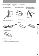 Checking the supplied accessories AC power adaptor (1) Battery charging stand (1) Dedicated USB cable (1) Headphones/earphones with a remote control (1) NH-14WM Nickel metal hydride rechargeable battery (1) Recorder Operation Dry battery case (1) Battery carrying case (1) CD-ROM (SonicStage Ver. 1.5) (1)* Carrying pouch (1) ∗ Do not play a CD-ROM on an audio CD player.