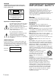WARNING TO REDUCE THE RISK OF FIRE OR ELECTRIC SHOCK, DO NOT EXPOSE THIS APPLIANCE TO RAIN OR MOISTURE. CAUTION RISK OF ELECTRIC SHOCK DO NOT OPEN “CAUTION:TO REDUCE THE RISK OF ELECTRIC SHOCK, DO NOT REMOVE COVER (OR BACK). NO USER-SERVICEABLE PARTS INSIDE. REFER SERVICING TO QUALIFIED SERVICE PERSONNEL.” IMPORTANT SAFETY Read the Operating Instructions carefully and completely before operating the unit. Be sure to keep the Operating Instructions for future reference.
