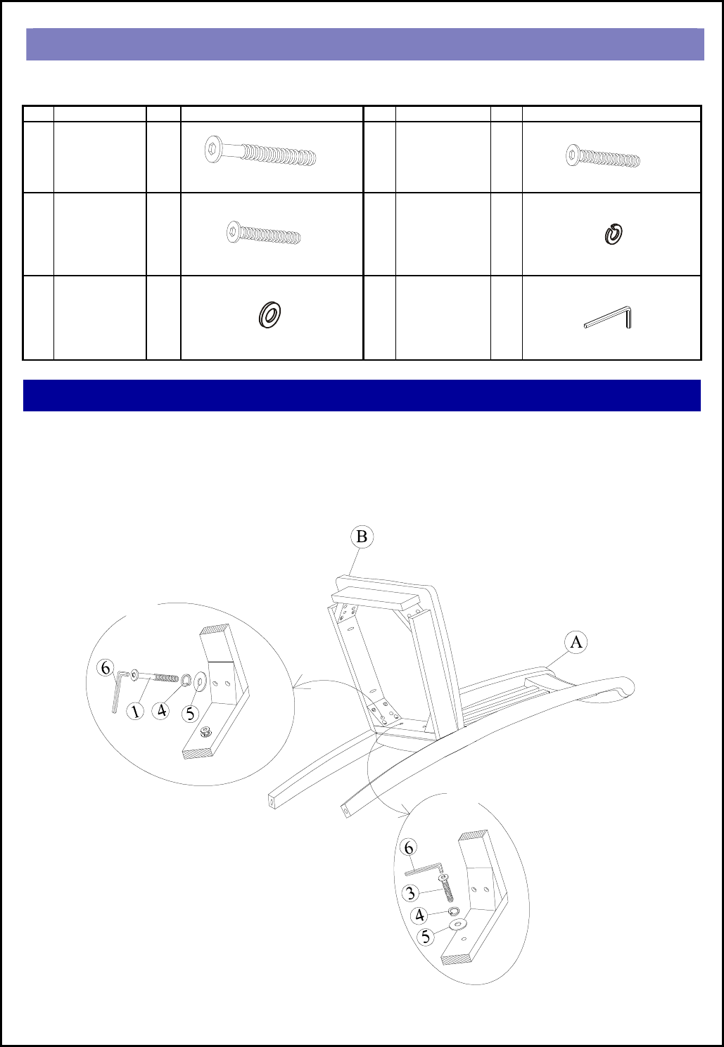 Attach frame (B) to the back (A) by using bolts (3) and (1) and washers (4) and (5). Tighten with Allen