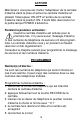 Si le branchement de téléphone est remis pendant cette période, la sirène s’arrêtera après 30 secondes (ou appuyez sur la touche OFF sur la télécommande pour arrêter la sirène précipitamment). Si le branchement de téléphone n’est PAS remis dans 30 secondes, la sirène s’arrêtera sûrement après 30 secondes mais 3 brefs bibs continueront à résonner jusqu’à le branchement est remis. Faites attention que seulement une interruption ou une coupure de courant de votre branchement de téléphone seront constatées.