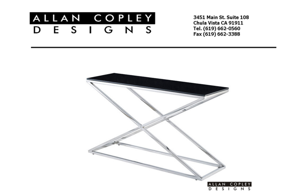 ACD-20804-03 Excel Console 52" L x 16" W x 29" H 79.00lbs Available Top : Base with 1/2" Thick, Lay on Black Glass top Finish : Stock Finish; "Polished Stainless Steel" Product Description: www.allancopley.