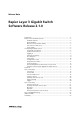 Release Note ■ Packet Forwarding at wire speed. ■ Store and Forward switching mode. ■ Autonegotiation of link speed and duplex mode for 10/100 Mbps speed on all 100BASE TX ports. ■ Autonegotiation of duplex mode for 10/100 and gigabit Ethernet ports. ■ Automatic, configurable MAC address learning and ageing, supporting up to 8191 MAC addresses per switch. ■ Switch Filtering. ■ Flow Control. ■ Broadcast Storm Protection. ■ Spanning Tree Protocol.