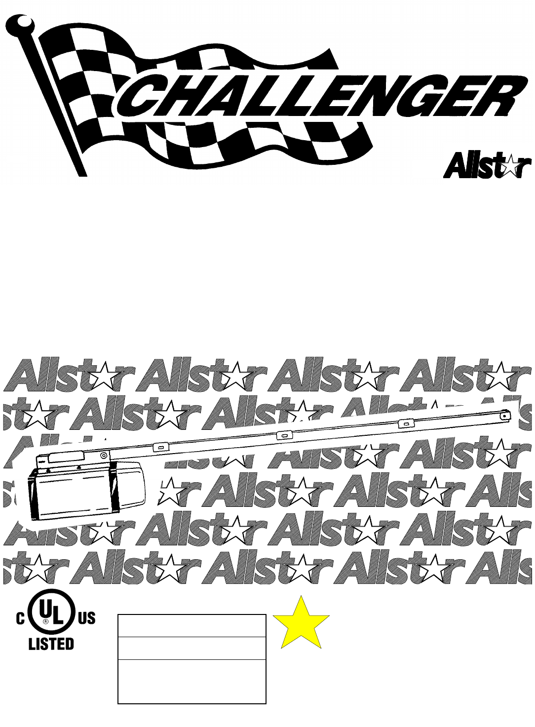 10060 BY CHALLENGER AC9000 SERIES Residential Vehicular Garage Door Operator MODEL NUMBERS AC9300, AC9500, and ACJ9500 I N S TA L L AT I O N A N D O W N E R ’ S M A N U A L INSTALLER: Place this manual in the plastic envelope provided and permanently attach to the wall near the pushbutton.