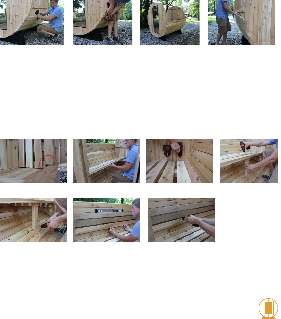 Each barrel sauna includes two pre-assembled benches that are side specic. Be sure the shorter bench slat is in front and against the doorframe